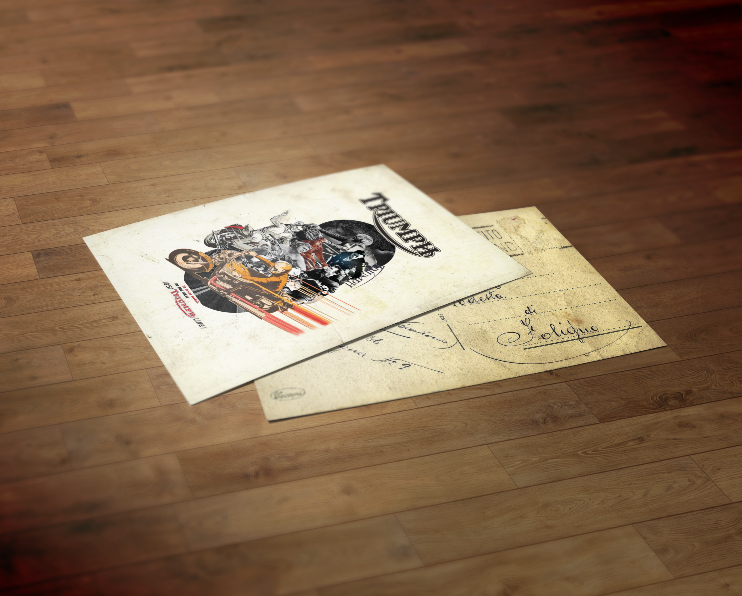 Postcards with collages of motorcycle's world